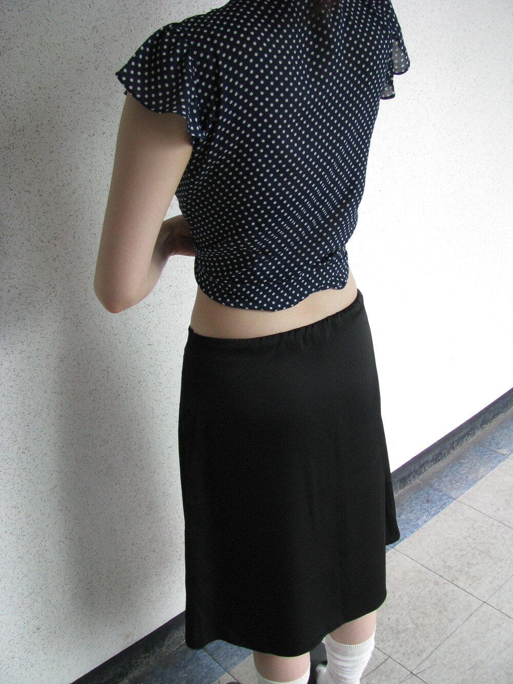 사이드 지퍼와 뒷 밴딩이 있어 로우하게 골반에 걸쳐 입을 수 있는 미디스커트입니다.
