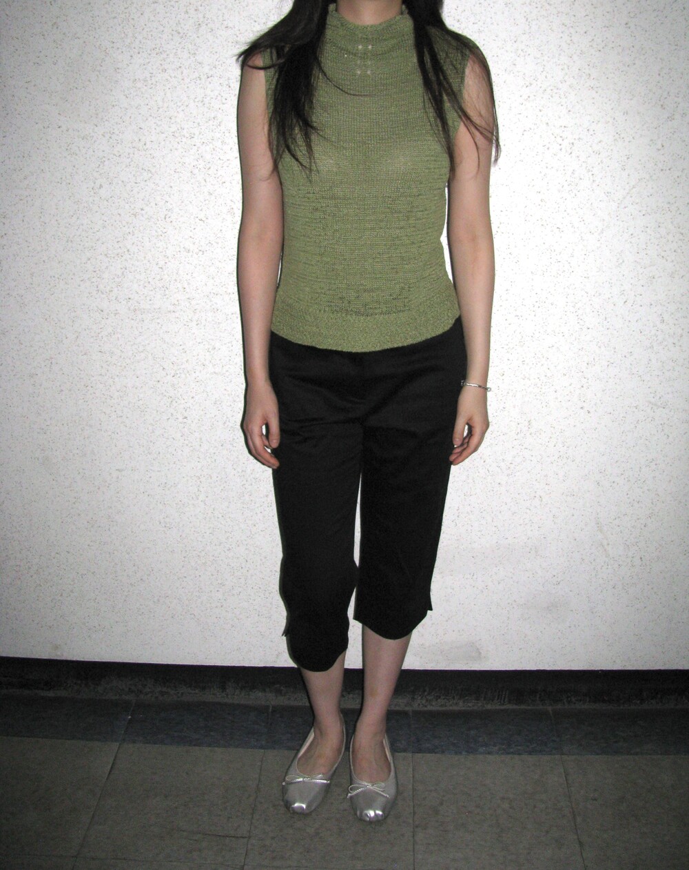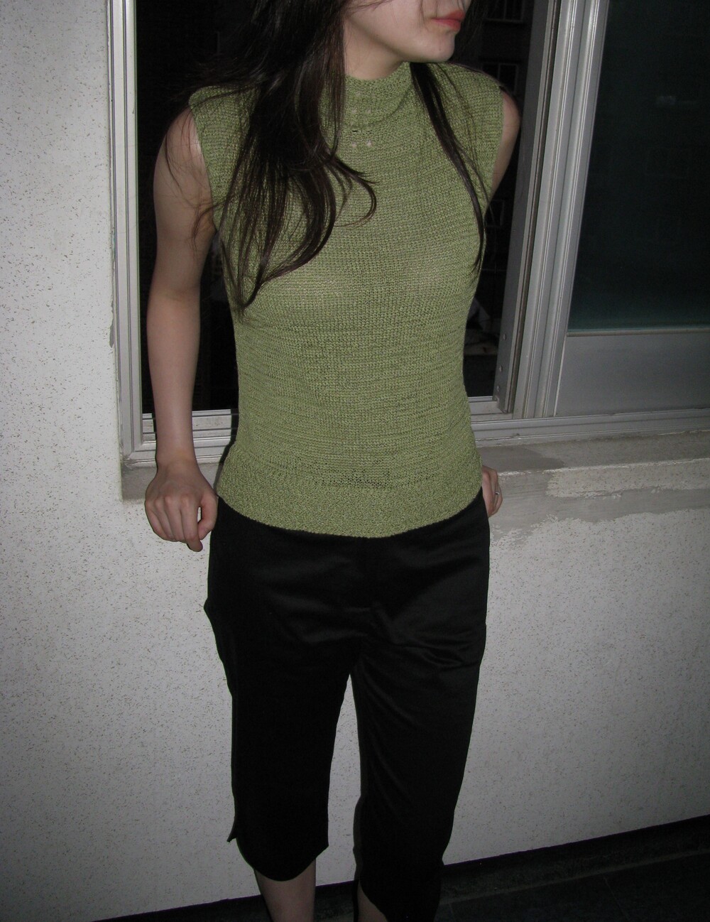 빈티지한 그린 색감의 앞뒤 넥라인 포인트가 있는 서머니트 재질 슬리브리스 탑입니다.